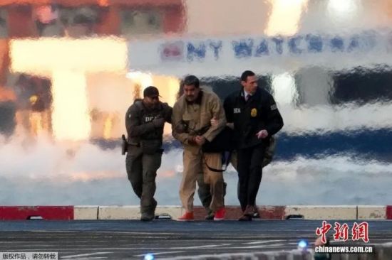 当地时间1月5日,委内瑞拉总统马杜罗抵达美国纽约联邦法庭,将在这里首次出庭受审。图为马...